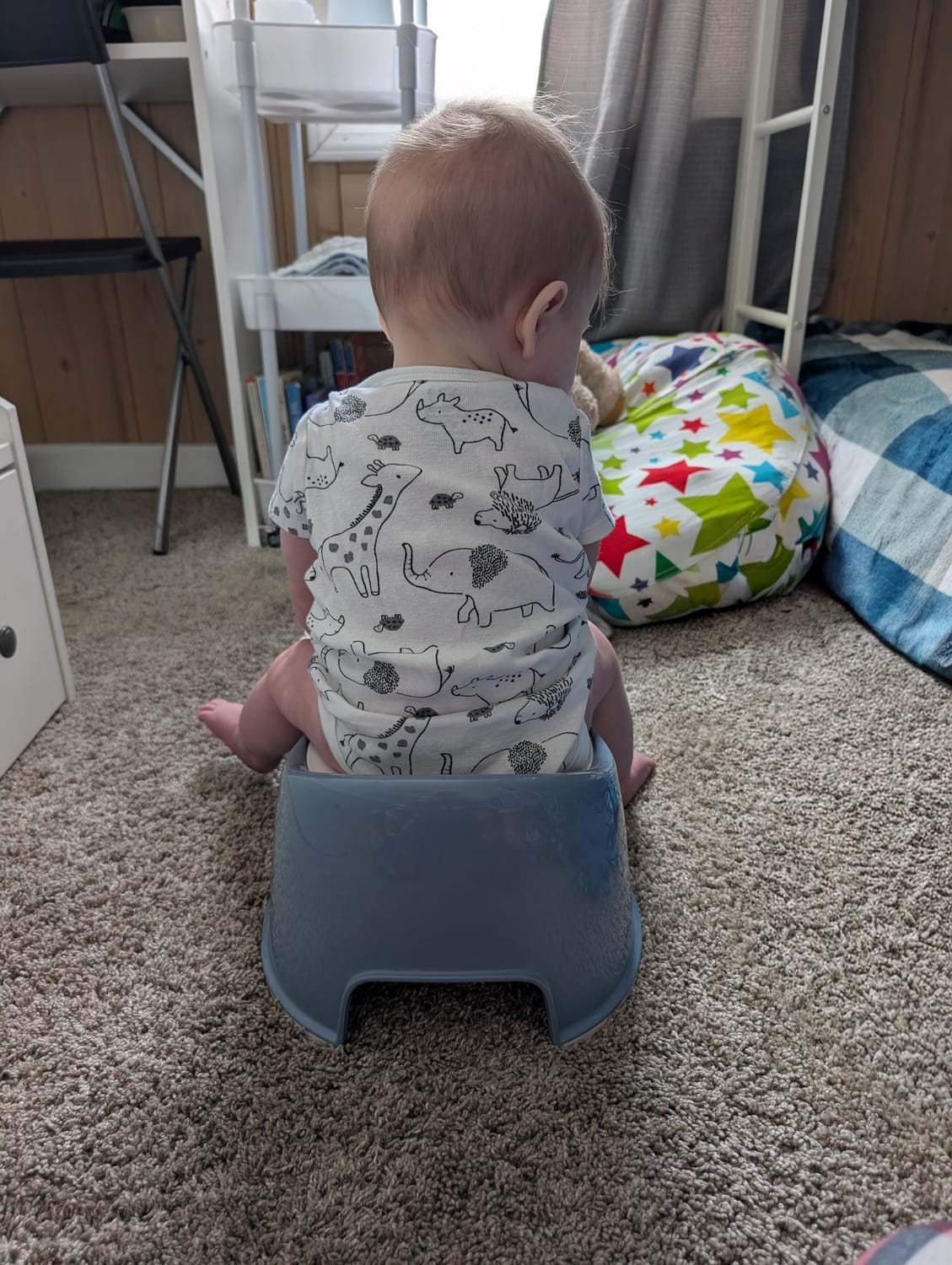 Cloth diapers have been huge for this process. Disposable diapers are designed to wick moisture away so efficiently that babies barely feel wet. Cloth lets him notice the sensation. Not in a harsh way, just in a natural cause-and-effect way.